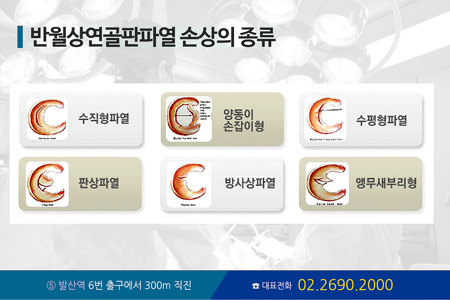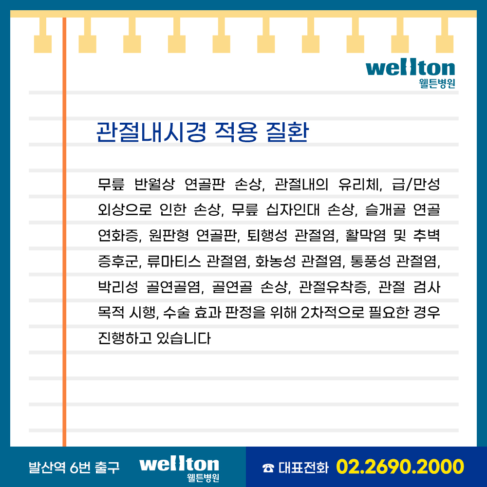 관절내시경 수술은 무릎 반월상 연골판 파열, 관절내의 유리체, 급/만성 외상으로 인한 손상, 무릎 십자인대 손상, 슬개골 연화증, 원판형 연골판, 퇴행성 관절염, 활막염 및 추벽 증후군, 류마티스 관절염, 화농성 관절염, 통풍성 관절염, 골연골 손상 등의 경우에 시행하고 있습니다.