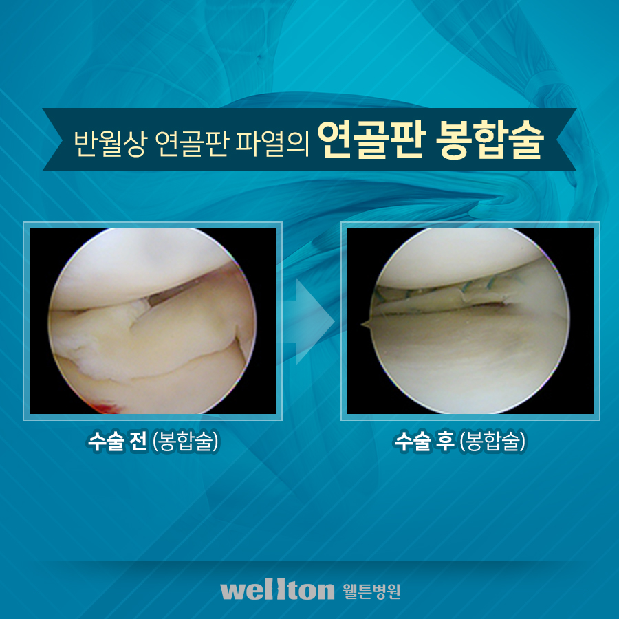 무릎 관절안의 좁은 공간에서 수술용 실로 연골판을 봉합해야 하기 때문에 절제술보다는 난이도가 높은 수술이며 의료진의 테크닉적 의술 및 노하우가 중요하기도 합니다. 연골판을 봉합하여 원래의 모습으로 복구시켜 정상적인 활동이 가능하도록 해줄 수 있습니다.