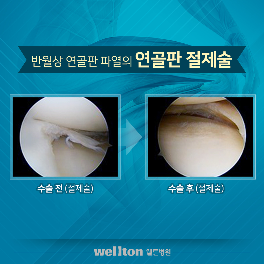 먼저 파열된 연골판이 재생될 가능성이 낮고 파열이 심할 때는 관절면을 매끄럽게 정리해 주는 절제술이 필요합니다. 파열된 연골판으로 다른 주변 연골들까지 손상시킬 수 있고 손상된 연골판으로 움직임에 장애가 생길 수 있기 때문에 움직임의 문제가 없도록 연골판을 매끄럽게 다듬어주어야 합니다.