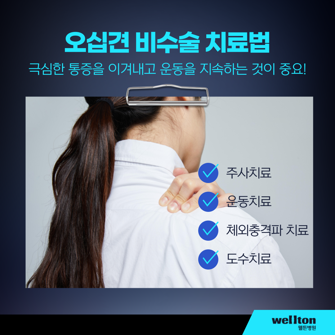 - 도수치료 : 전문 물리치료사가 어깨의 경직을 풀어주고 통증을 줄입니다.