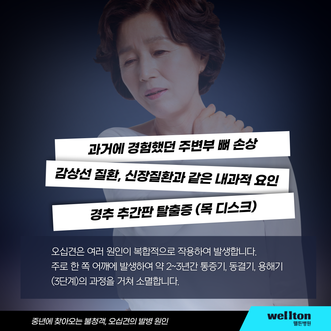 오십견은 주로 과거에 경험했던 주변부 뼈의 손상, 갑상선 질환, 당뇨질환, 과도한 어깨의 사용 등 몇가지 원인이 복합적으로 작용해서 발병하는 것으로 알려져 있습니다. 특히 당뇨환자의 경우는 일반인에 비하여 약 20%정도 더 높은 발병율을 보이며, 남성보다는 여성에게 더 많이 발병합니다.