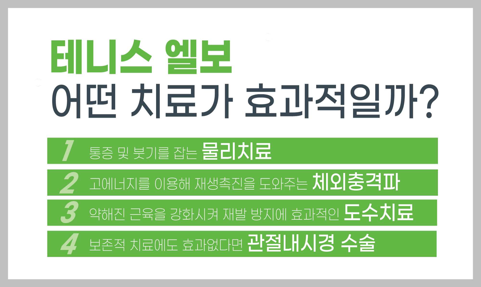 여러가지 보존적 치료를 시도했음에도 증상이 전혀 나아지지 않는다면 관절내시경 수술을 통해 손상된 부위를 직접적으로 다듬어주거나 봉합해주어야 하지만, 테니스 엘보의 경우 위 사항만 잘 지켜준다면 수술 단계까지 이르는 경우는 거의 없으니 걱정하지 않으셔도 됩니다.